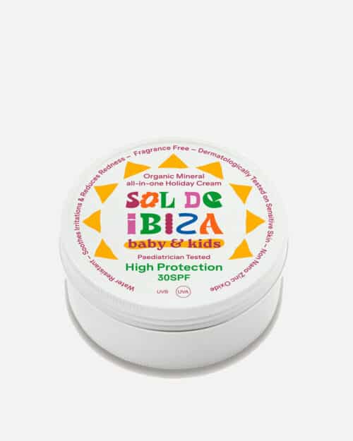 Økologisk og naturlig solcreme med solfaktor 30 til børn og babyer fra spanske Sol de Ibiza er fremstillet af veganske, økologiske og naturlige ingredienser som ikke er skadelig for hverken dig, vores natur eller havmiljø. Solcremen er nem at have med på farten, da den ikke fylder meget i tasken – den er fast, så du skal ikke bekymre dig om det løber ud i tasken.