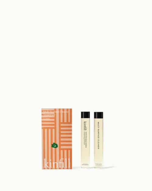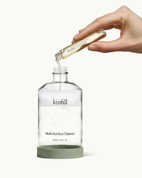 Koncentreret rengøringsmiddel fra Kinfill kommer i en lille refill af glas med et låg af metal. Det skal blot blandes med vand fra hanen – enkelt og effektiv rengøring uden unødvendig fylde af vand og emballage.
