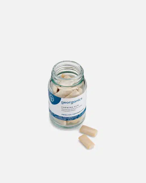 Lavet af komposterbar Sapodilla Chicle og arabisk gummi fra sapodilla- og akacietræerne, er disse naturlige tyggegummier smagsat med pebermynte og xylitol for en kølig og forfriskende mundfornemmelse. Vores tyggegummi giver friskhed til din ånde, samtidig med at det fjerner madrester og bakterier forbundet med dårlig ånde og huller i tænderne. Tyggegummiet producerer spyt, der skyller munden og vasker bakterier væk, hvilket beskytter tænderne mod bakteriesyre, der forårsager huller.