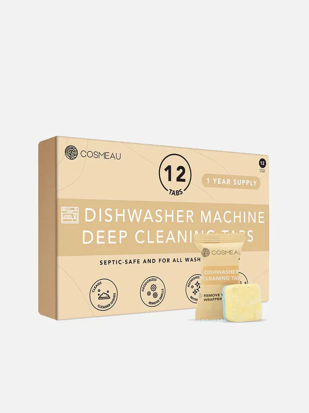 Pakken indeholder 12 rengøringstabletter som rækker til 1 års forbrug og leveres i en æske af genanvendt pap som kan sorteres til genanvendelse igen.