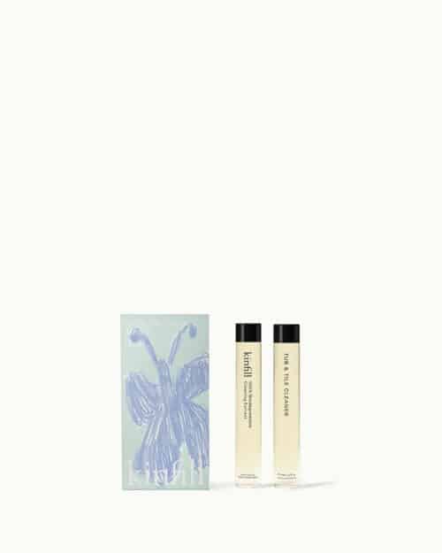 Koncentreret rengøringsmiddel fra Kinfill kommer i en lille refill af glas med et låg af metal. Det skal blot blandes med vand fra hanen – enkelt og effektiv rengøring uden unødvendig fylde af vand og emballage.